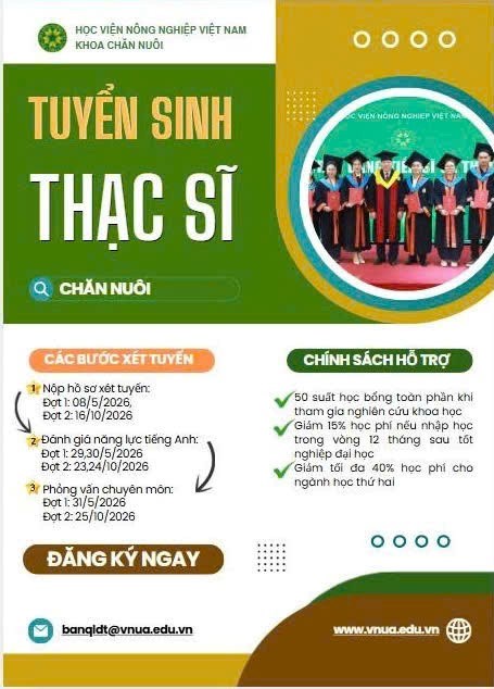 Học viện Nông nghiệp Việt Nam (Học viện) thông báo tuyển sinh đào tạo trình độ thạc sĩ ngành Chăn nuôi năm 2026 như sau:
