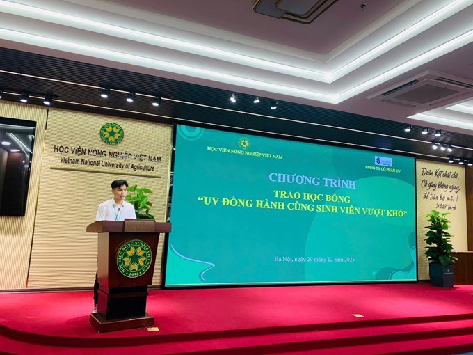 Sáng ngày 29/12/2025, tại Hội trường Nguyệt Quế – Học viện Nông nghiệp Việt Nam, chương trình trao học bổng “UV – Đồng hành cùng sinh viên vượt khó” đã được tổ chức trong không khí trang trọng, ấm áp và giàu ý nghĩa nhân văn. Đây là hoạt động thiết thực nhằm hỗ trợ, động viên những sinh viên có hoàn cảnh khó khăn nhưng luôn nỗ lực vươn lên trong học tập và rèn luyện, đặc biệt là sinh viên thuộc khối ngành Chăn nuôi – Thú y.